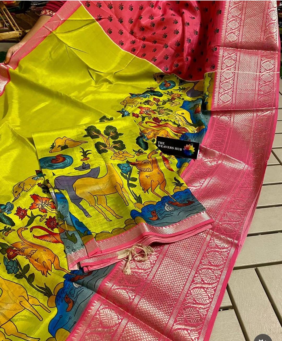 Famous for heavy silk, bold colours, and pure gold/silver zari borders. - Mysore Silk (Karnataka)